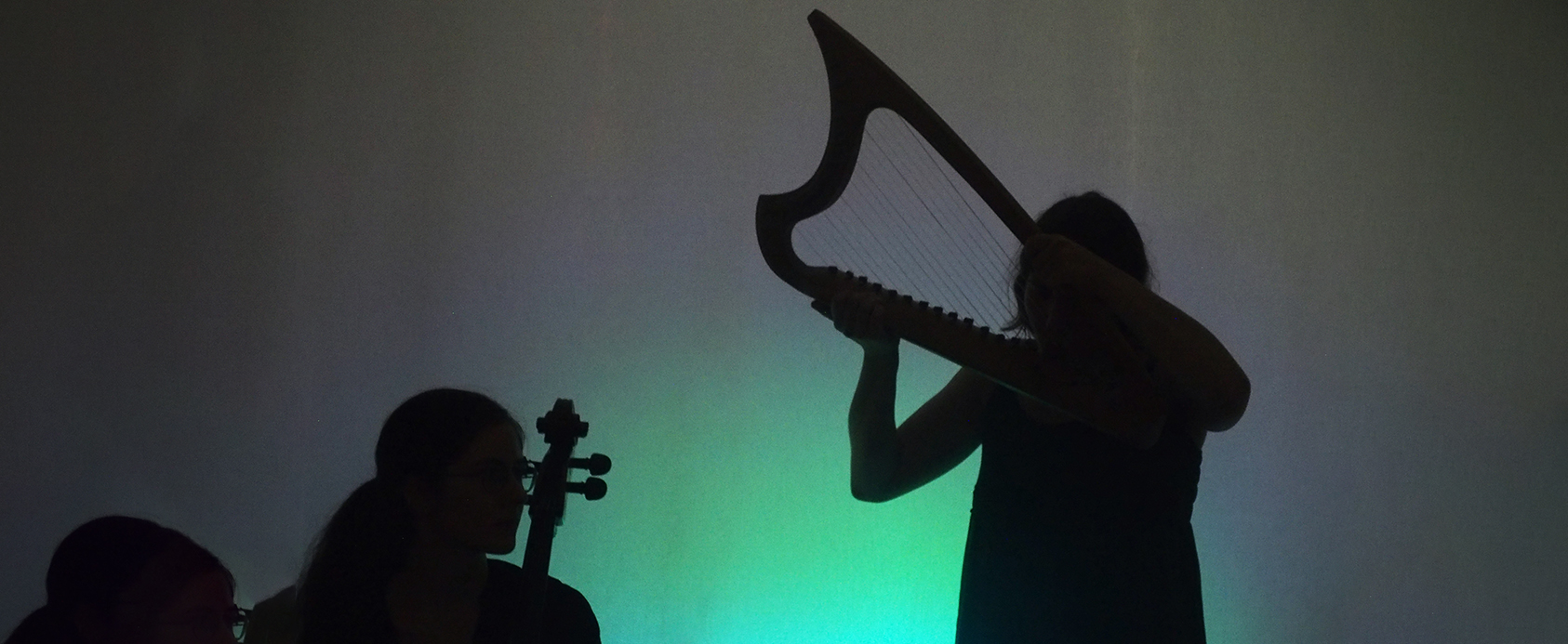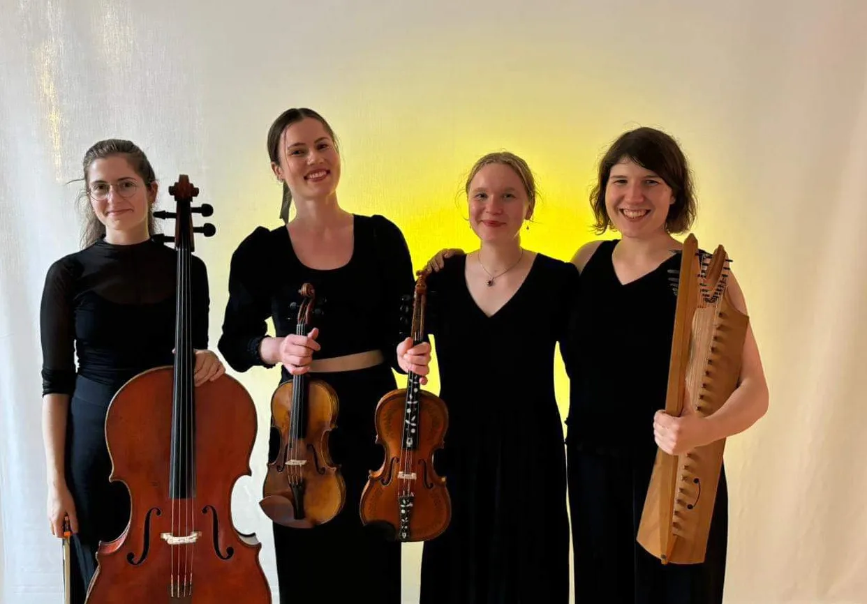 The centrepiece of the ‘Traumgsang’ concert was the Norwegian song cycle ‘Draumkvedet’ from the Middle Ages, which, similar to Dante's Divina Commedia, tells of a journey through hell, purgatory and paradise. The melodies have only been passed down orally and there are over 100 different versions of them. The Quartensprung ensemble put together its own version for violin/Hardanger fiddle, Gothic harp, cello and voice for this project. Musically, the Draumkvedet and folk tunes were supplemented with thematically related contemporary pieces and thus woven into a coherent overall concert dramaturgy. A shadow play visually enhanced the musical action.